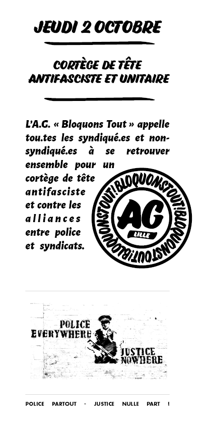 L'AG "Bloquons Tout" appelle toustes les syndiqué.es et non-syndiqué.es à se retrouver ensemble pour un cortège de tête antifasciste et contre les alliances entre police et syndicats.