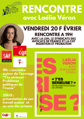 Dans un premier temps, Laélia Véron présentera pendant une heure son nouveau livre ""T'es sérieuse ?" - Problèmes politiques de l'ironie".