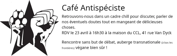 Un temps pour se retrouver et faire se croiser les luttes anarchistes et antispécistes. Temps convivial, ouvert aux curieu·ses·x, sans objectif de débat.