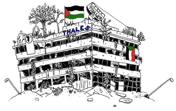 En Palestine, les drones Hermes 900 et Heron TP de l'armée d'occupation ne pourraient ni voler, ni surveiller, ni bombarder sans les équipements vendus par Thales. Ses nombreuses collaborations avec les marchands d'armes Elbit Systems et Israel Aerospace Industries, piliers de la machine de guerre israélienne, en font un complice actif du génocide et de la colonisation.